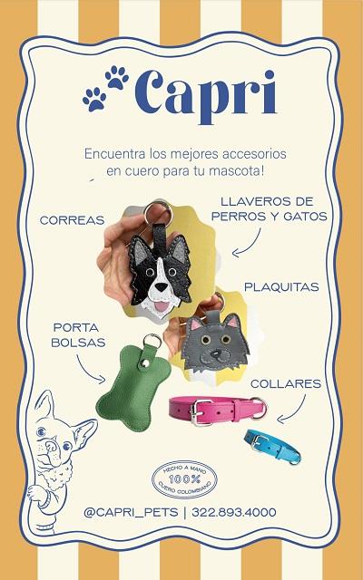 Capri Pets es una marca de accesorios para mascotas elaborados en 100% cuero colombiano. Creamos collares, correas, portabolsas, plaquitas y llaveros con la cara de perros y gatos, combinando diseño, calidad y detalle artesanal para celebrar el vínculo único entre las personas y sus mascotas.